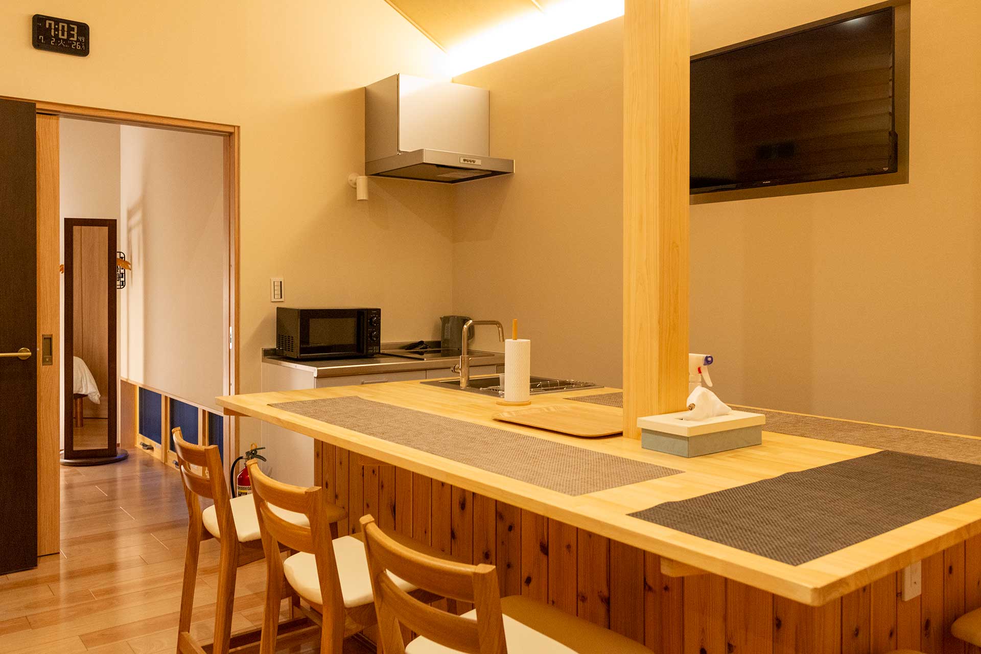 素泊まり専門の宿だからこそ、簡易的なキッチンダイニングも完備しております。大型製氷機も完備。持ち込みでの軽食や仲間内での飲み会等、便利にお使いいただけます。
